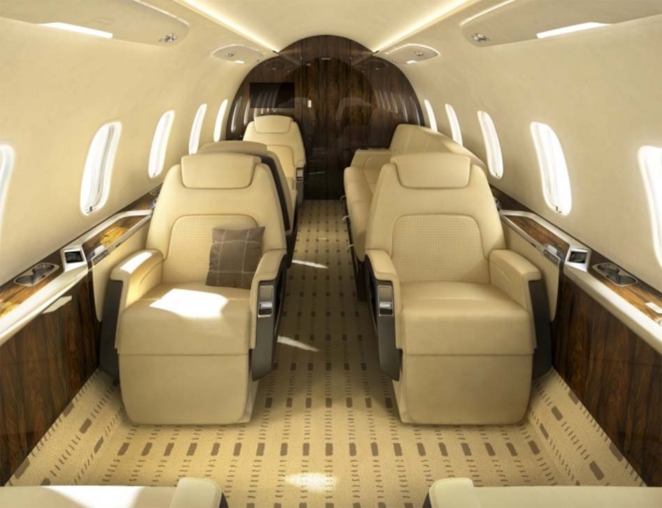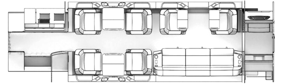 En su configuración estándar, la cabina está diseñada para ocho pasajeros en dos secciones club, o para nueve si uno de ellos acepta pasar el vuelo en el aseo en un asiento especialmente equipado. Sin embargo, como opción, se puede instalar un sofá de tres plazas en lugar de dos asientos en la parte trasera de la cabina. Mesas plegables de 60 x 63 cm separan los pares de asientos, y la longitud del suelo de la cabina es de 503 cm.