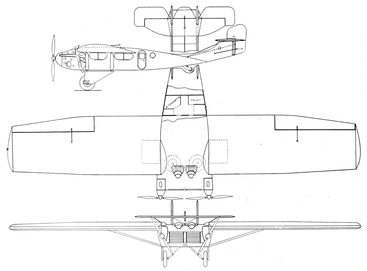 However, the pilots were still ‘in the open air’ in exposed cockpits located in front of the wing. In contrast, the passenger cabin was enclosed, well-lit, heated, and upholstered in plush. The passenger compartment, measuring 5.5 x 3.65 meters, included a washbasin and a toilet for passenger comfort.