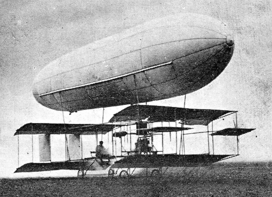 For pitch control, the aircraft was equipped with a front horizontal stabilizer. Twin rudders were installed behind the rear wing. In one of its variants, the tandem biplane was suspended on four struts beneath a cigar-shaped air balloon, exploring alternative lift methods.