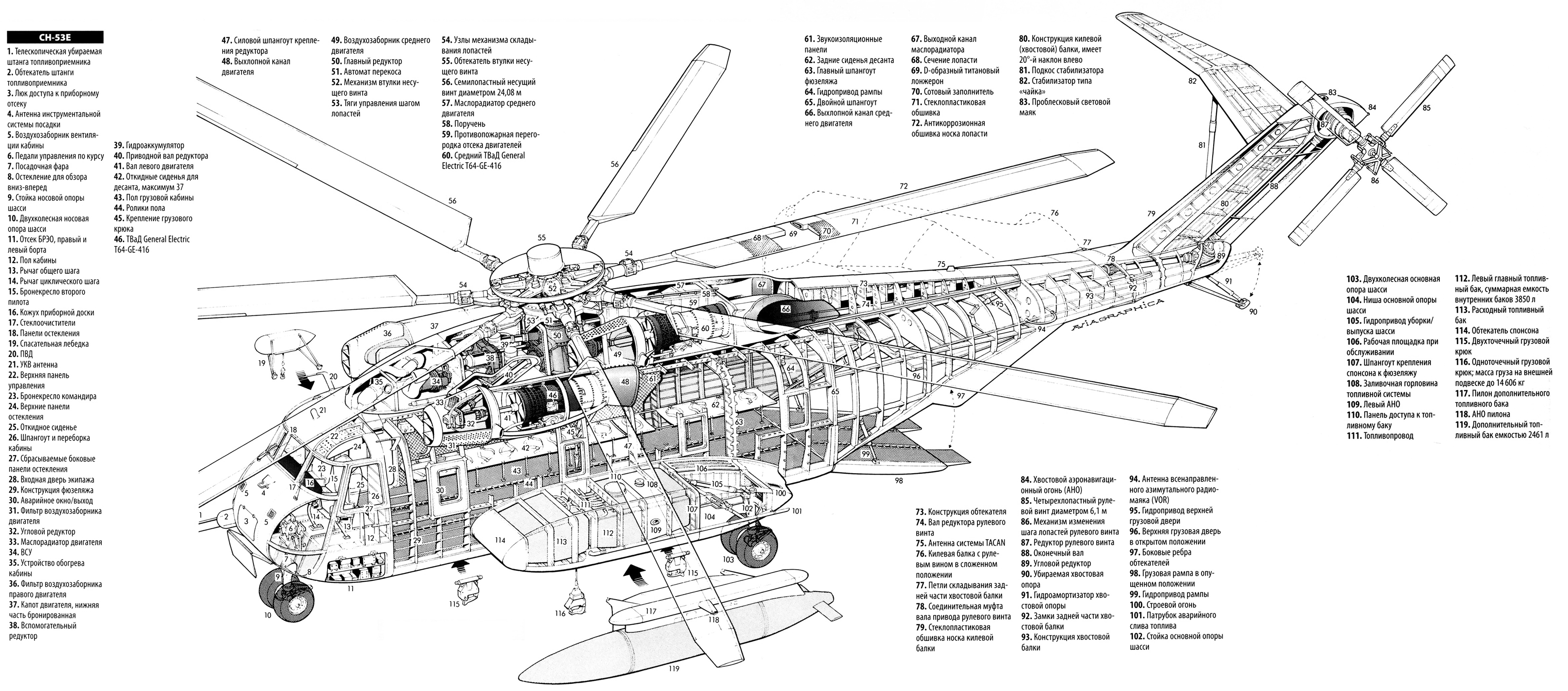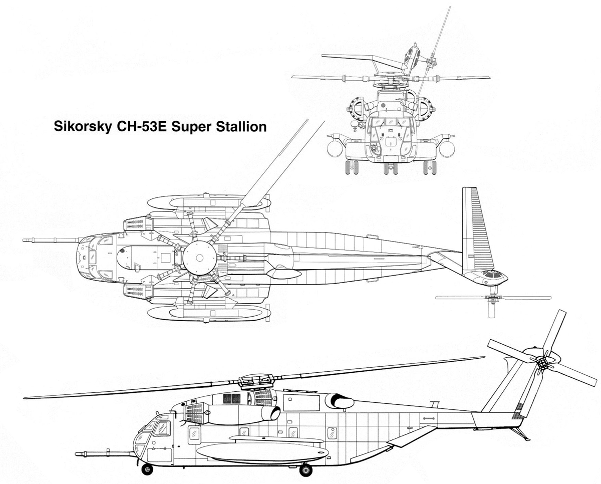 Development of the heavy-lift assault transport helicopter CH-53E for the U.S. Marine Corps began in 1971. The CH-53E Super Stallion is an evolution of the CH-53A, sharing 50% of its components and parts, but featuring increased payload, a triple-engine power plant, and larger cargo cabin dimensions, as well as main and tail rotor diameters. Requirements for the CH-53E included carrying an external load of 16 tons with a range of 92 km, taking off from a sea-level site, to compete with the Army’s S-64B crane helicopter with a maximum payload of 18 tons carried on a sling. Other tasks involved transporting an internal load of 3630 kg with a range of 185 km, taking off from a site at 915m altitude at 33°C, or transporting 37 marines over a distance of 536 km. The ferry range was 1870 km.