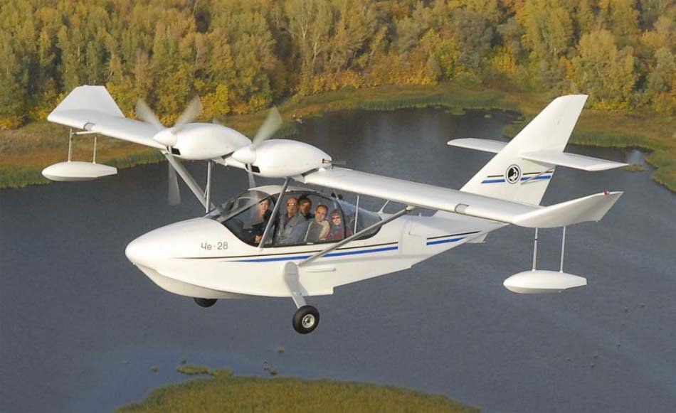 This amphibian aircraft is designed to transport four passengers and up to 80 kg of baggage or cargo. The Che-28 features a modern onboard navigation and piloting complex with a satellite GPS system and a contemporary radio station. It is equipped with two 100 hp Rotax-912USL engines, which run on A-95 automotive gasoline, consuming only 28 liters per hour. Furthermore, in the event of an engine failure, the aircraft can continue horizontal flight to the nearest body of water or airfield. Take-off distances are 70 meters on ground and 90 meters from water, and the seaplane’s cabin width is 1250 mm.