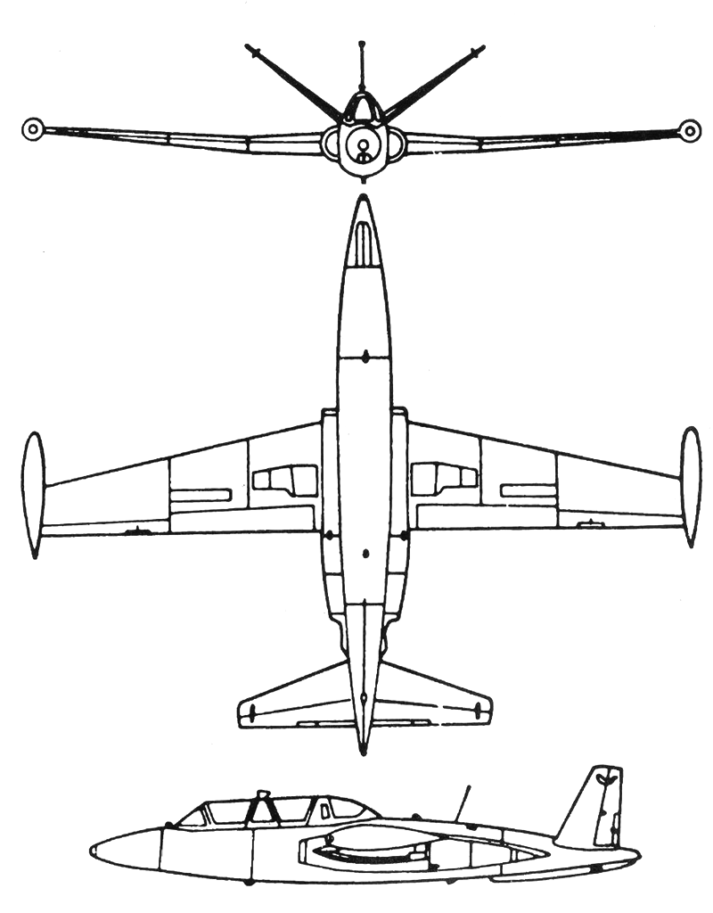 For its powerplant, the Magister is equipped with two Turbomeca Marboré IIA (2 x 400 kgf) or Marboré VIC (2 x 480 kgf) turbojets, mounted on the fuselage sides. Air intakes are semicircular and located laterally. Fuel is stored in two fuselage tanks with a total capacity of 730 liters. Additionally, two 120-liter tanks can be installed at the wingtips. A special tank ensures engine fuel supply during inverted flight for 30 seconds.