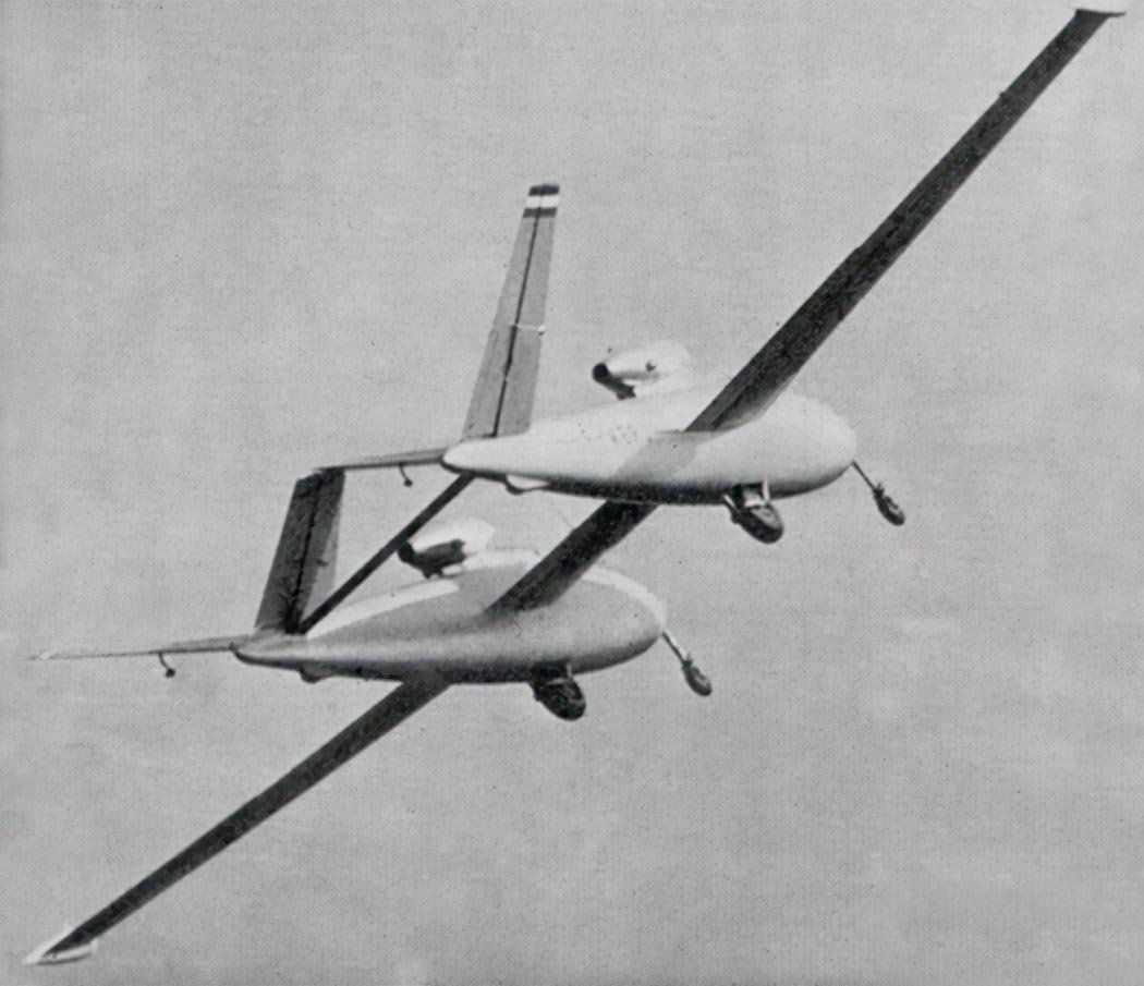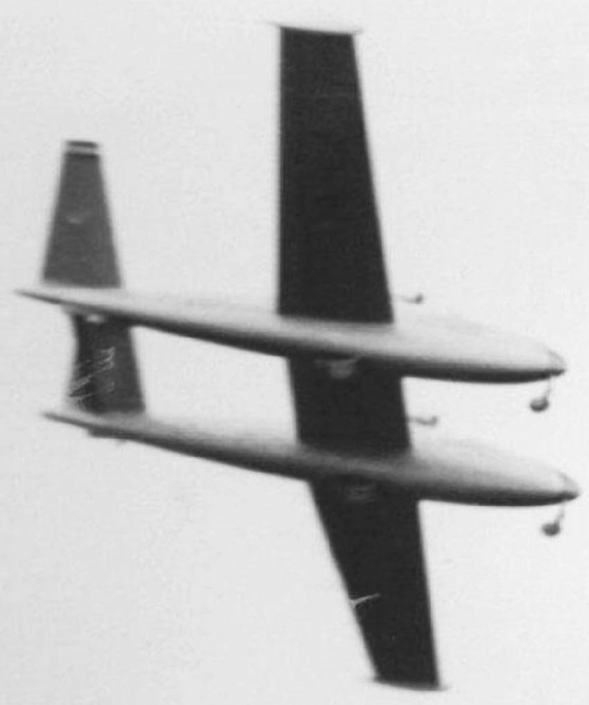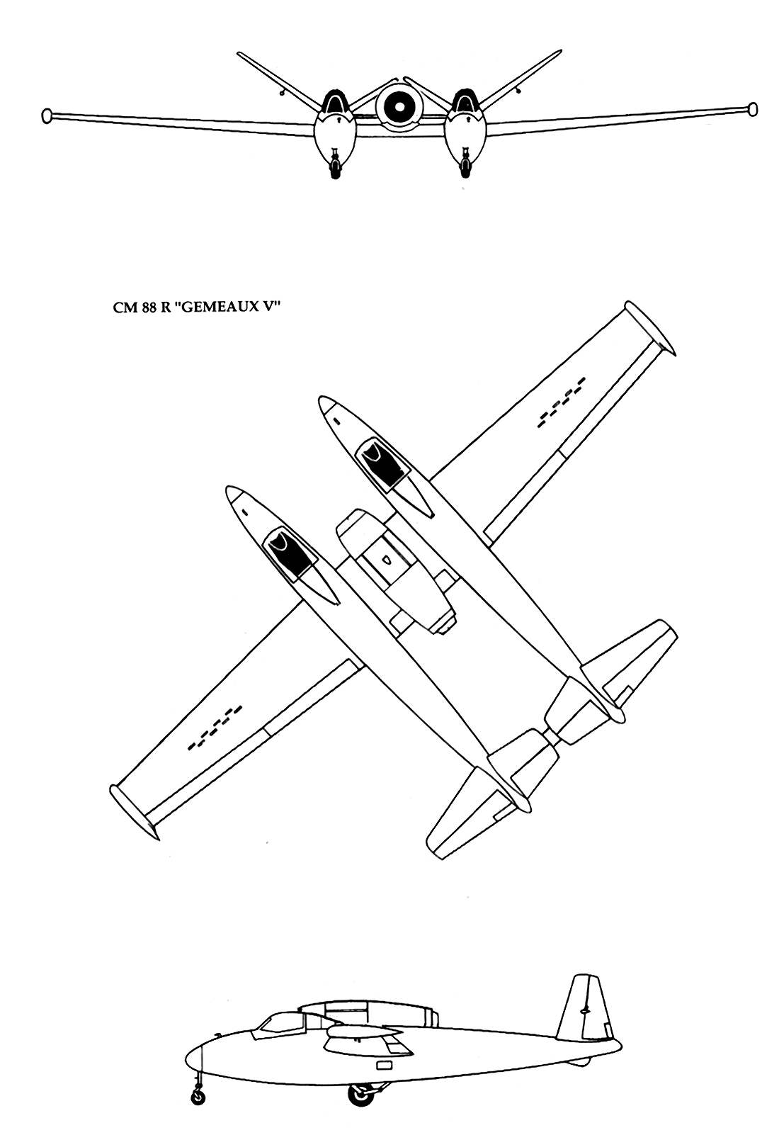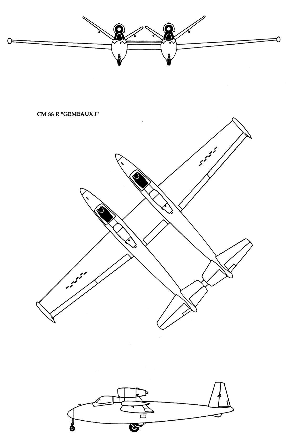 The CM.88-R Gemeaux was an experimental aircraft developed by the French firm Fouga, based on the CM.8R Midjet trainer. Fouga aimed to create a flying testbed for Turbomeca engines. To achieve this, they combined two CM.8R-9.8 fuselages with a central wing section and linked their rear parts with the inner consoles of a V-tail stabilizer.