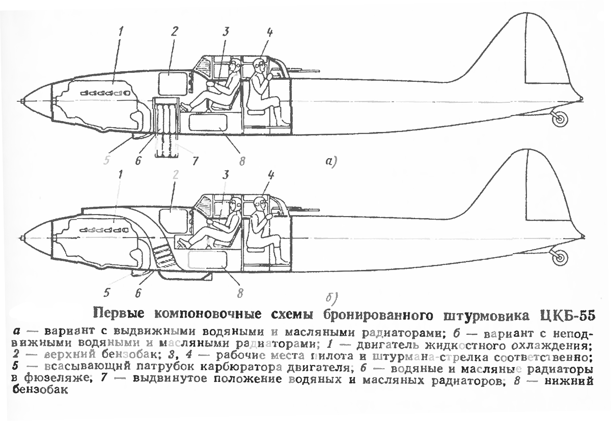 During detailed design, Ilyushin’s OKB simplified the armor scheme, abandoning internal capsules and retaining a continuous armored hull. This hull protected the engine, radiators, tanks, pilot, and gunner-navigator, supplemented by localized armored shields for crew protection. The armor thickness remained 5 mm throughout. By January 3, 1939, Ilyushin presented the mockup of the BSh-2 (factory designation TsKB-55) with the AM-34FRN engine for approval.