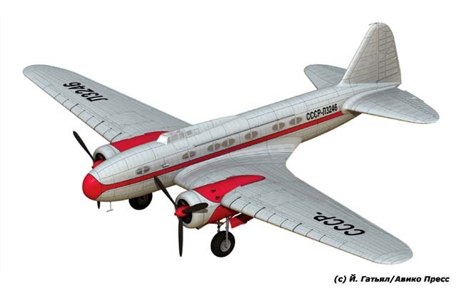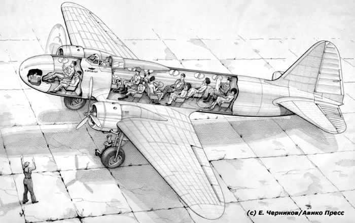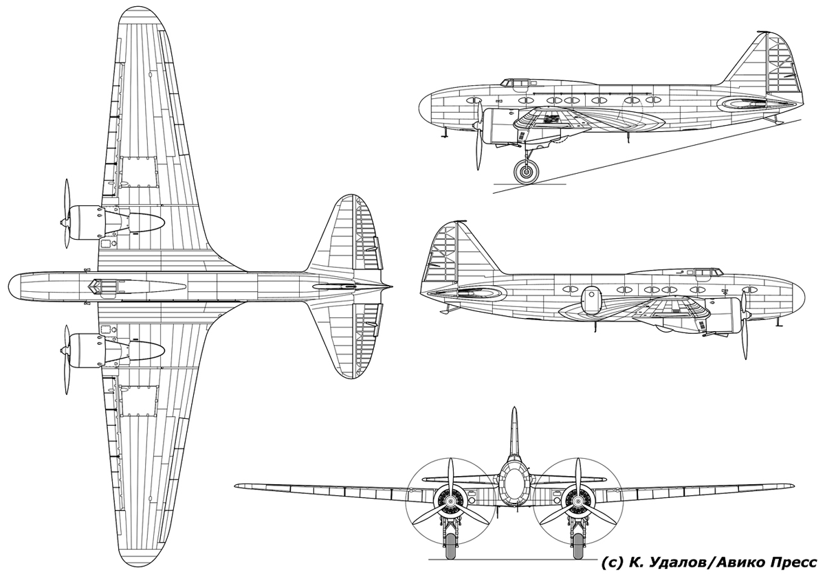 Based on this and considering Aeroflot’s need for new aviation equipment, in 1935 S. V. Ilyushin proactively proposed a passenger variant of the BB-2 bomber (TsKB-30). The project was worked out in a first approximation, as evidenced by discovered documents. The full text of a memorandum, signed by the head of brigade No. 3, S. V. Ilyushin, is provided below. The oldest employee of the Design Bureau, E. S. Chernikov, restored the appearance and layout of this interesting aircraft from old tracings. The materials were first published in the almanac “Nashi Krylya” (Our Wings).