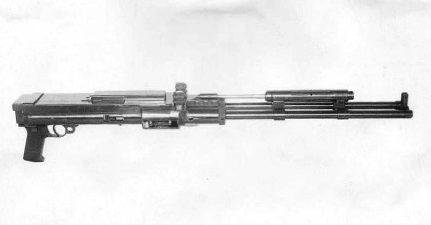 It should be noted that V.I. Silin should not be credited with originating the concept of a twin-barreled system. A similar twin-barreled machine gun system was developed at the end of World War I by German designer Karl Gast. Gast’s twin machine gun achieved a fantastic rate of fire of 1600 rounds/min at that time.